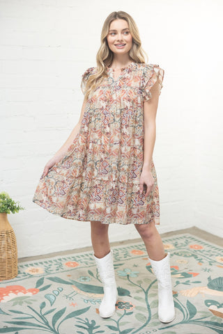 The multi-layered tiered silhouette creates gorgeous dimension and flow, making this dress perfect for twirling through farmers markets, garden parties, or sunset dinners. Crafted from premium printed woven fabric and fully lined for comfort and quality, this dress feels as wonderful as it looks.