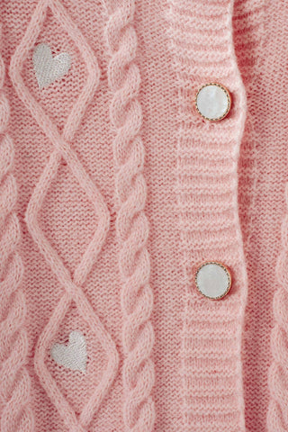 Romantic charm meets everyday comfort in this sweet cable knit cardigan that adds instant personality to any outfit. The Cable Knit Heart Embroidered Cardigan features delicate embroidered hearts scattered across a classic cable knit design — perfect for channeling coquette vibes or simply adding a touch of whimsy to your wardrobe.