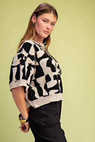 Elevate your everyday style with this eye-catching geometric print sweater that brings bold pattern and cozy comfort together. The lightweight blend of polyester, nylon, and wool creates a soft, breathable fabric perfect for layering or wearing solo. With its short sleeves and modern geometric design, it's the ideal piece to add visual interest to your wardrobe. The model pictured is 5'8" and wears a small, giving you a great reference for fit.