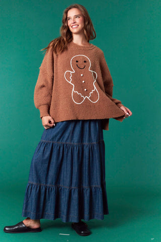 Spread holiday cheer in this whimsical Gingerbread Man Oversized Sweater Top! Crafted from soft 100% polyester, this cozy long-sleeve tee features a charming round neckline and an oversized silhouette perfect for layering or lounging. The playful gingerbread design captures festive spirit with effortless style. Model wears size Small (5'8", 32B bust, 25.5" waist, 37.5" hips). Part of our HOLIDAY 2025 collection.