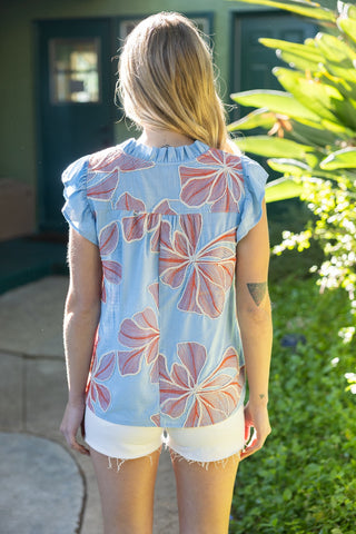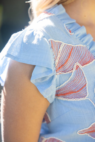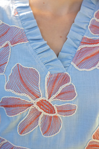 Introducing The Appliqué Top in a stunning blue hue—where artisanal craftsmanship meets effortless elegance. This exquisite piece showcases large-scale floral embroidery that transforms a classic silhouette into a work of wearable art, making it the statement top your wardrobe has been waiting for.