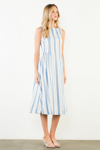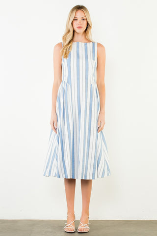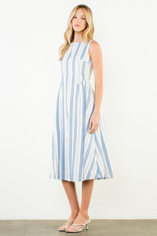 There's something timeless about a stripe. The Perfect Blue Striped Dress takes a classic pattern and gives it a fresh, feminine update — a sleeveless midi silhouette in crisp 100% cotton that feels as polished at a rooftop lunch as it does strolling through a weekend market.