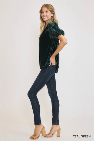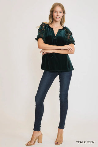 This split neck velvet top is both luxurious and versatile. Made with soft velvet material, it features a unique split neckline and delicate lace sleeves, adding a touch of femininity to any outfit. Choose from a variety of colorways, each with its own unique shine. The perfect addition to any wardrobe!
