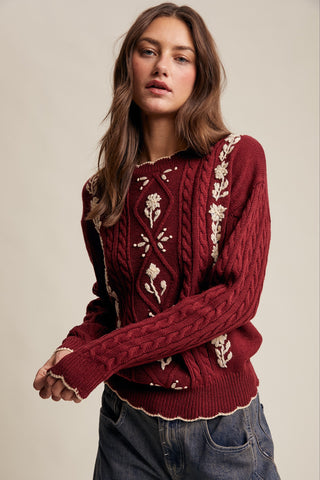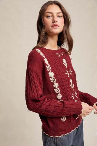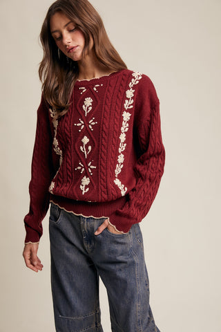 Imagine wrapping yourself in softness that feels like a gentle hug. The cable knit has just enough texture to feel special, while the relaxed fit moves with you throughout your day. The embroidery adds tactile interest you'll find yourself tracing with your fingertips. It's that rare combination of comfort and elegance—the sweater you'll reach for again and again.