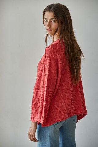 Cozy up in this charming cable knit sweater that's pure comfort meets style. Crafted from 100% cotton, it features a classic crew neck and three-quarter sleeves perfect for layering through the seasons. The side slits add a modern twist to this timeless silhouette, giving you easy movement and a flattering fit. Whether you're settling in with a good book or heading out for casual adventures, this dusty red pullover is your new go-to for effortless, put-together looks.