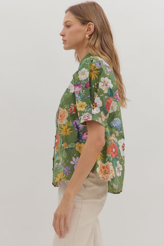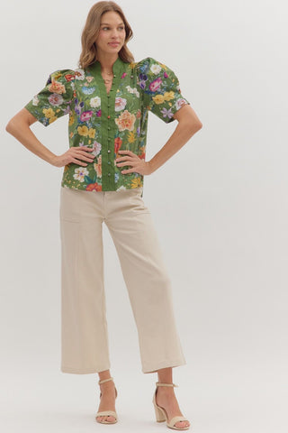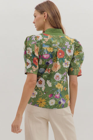 Bring botanical charm to your everyday wardrobe with this delightful olive floral top. Featuring a playful puff sleeve design and a distinctive contrast button-trimmed collar, it's equal parts sweet and sophisticated. The lightweight, semi-sheer cotton construction keeps you cool and comfortable, while the front button closure adds practical style. Perfect for layering or wearing solo, this unlined woven piece transitions effortlessly from casual outings to weekend adventures.