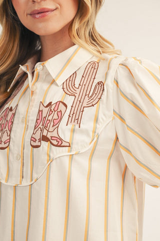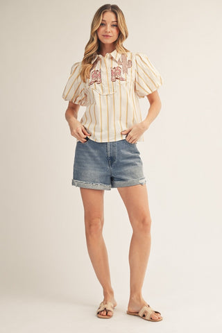 A little Western charm goes a long way. Our striped button-up brings countryside elegance to your everyday wardrobe with charming Western embroidery accents and feminine puff sleeves that add just the right touch of romance. It's the kind of top that feels special without trying too hard—perfect for those days when you want to look polished but feel completely at ease.