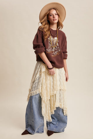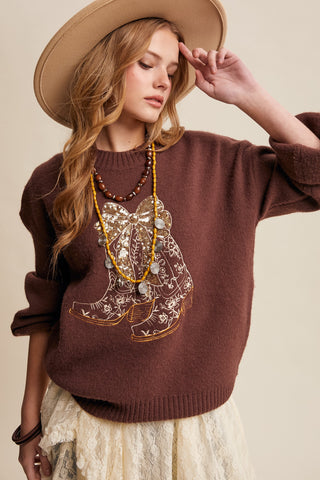 Cozy meets western charm in this easy-to-wear sweater that does all the styling work for you. The Brown Cowboy Boots Sweater features a soft knit feel with playful sequin cowboy boot details — perfect for adding personality to your everyday look without sacrificing comfort.