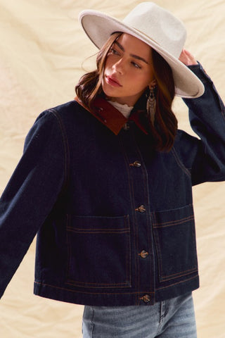 This Denim Cropped Barn Jacket brings classic cool with a playful twist. Featuring a cozy corduroy collar, it adds texture and warmth perfect for layering on crisp days. The cropped cut keeps your look fresh and fun, making it easy to pair with your favorite high-rise jeans or skirts. Whether you're heading to the farmers' market or just strolling through town, this jacket blends timeless style with a little bit of attitude.