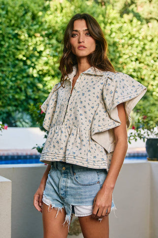 Meet the top you'll reach for on every warm-weather occasion. The Pintuck & Floral Print Top pairs wide flutter sleeves with delicate pintuck detailing and a soft floral print — a combination that feels effortlessly romantic without trying too hard.